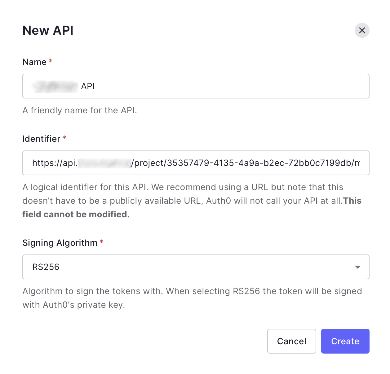 In Auth0, go to Applications > APIs then select Create API. On the next screen use the audience from the service configuration screen as