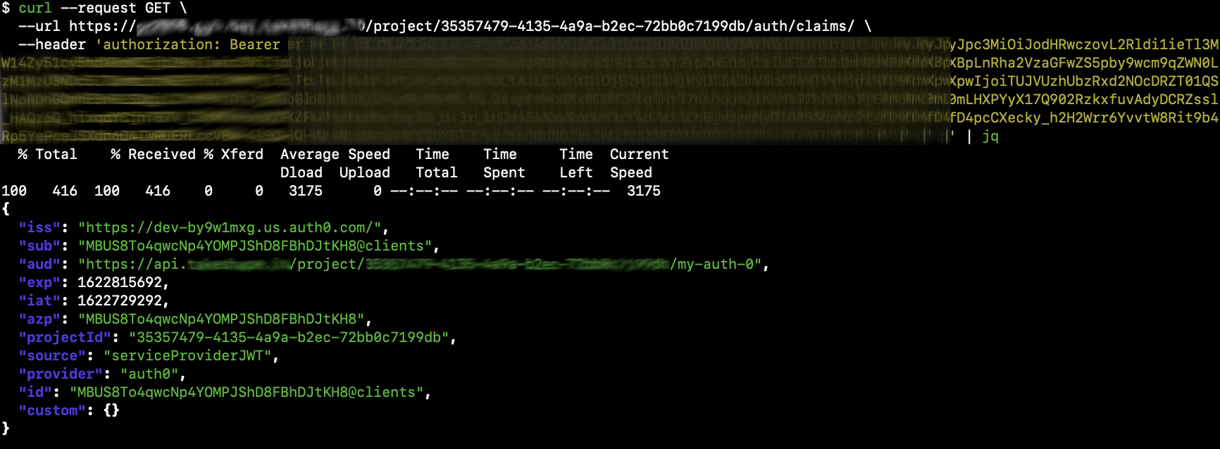 Running this command uses a special machine-to-machine access token in the request that validates that the service configuration is correct and the tokens from Auth0 are being processed.
